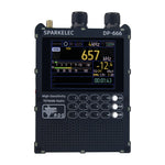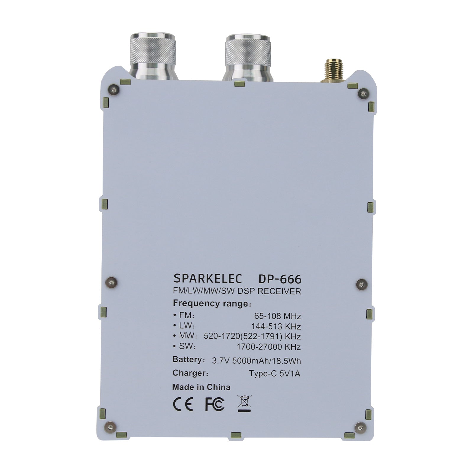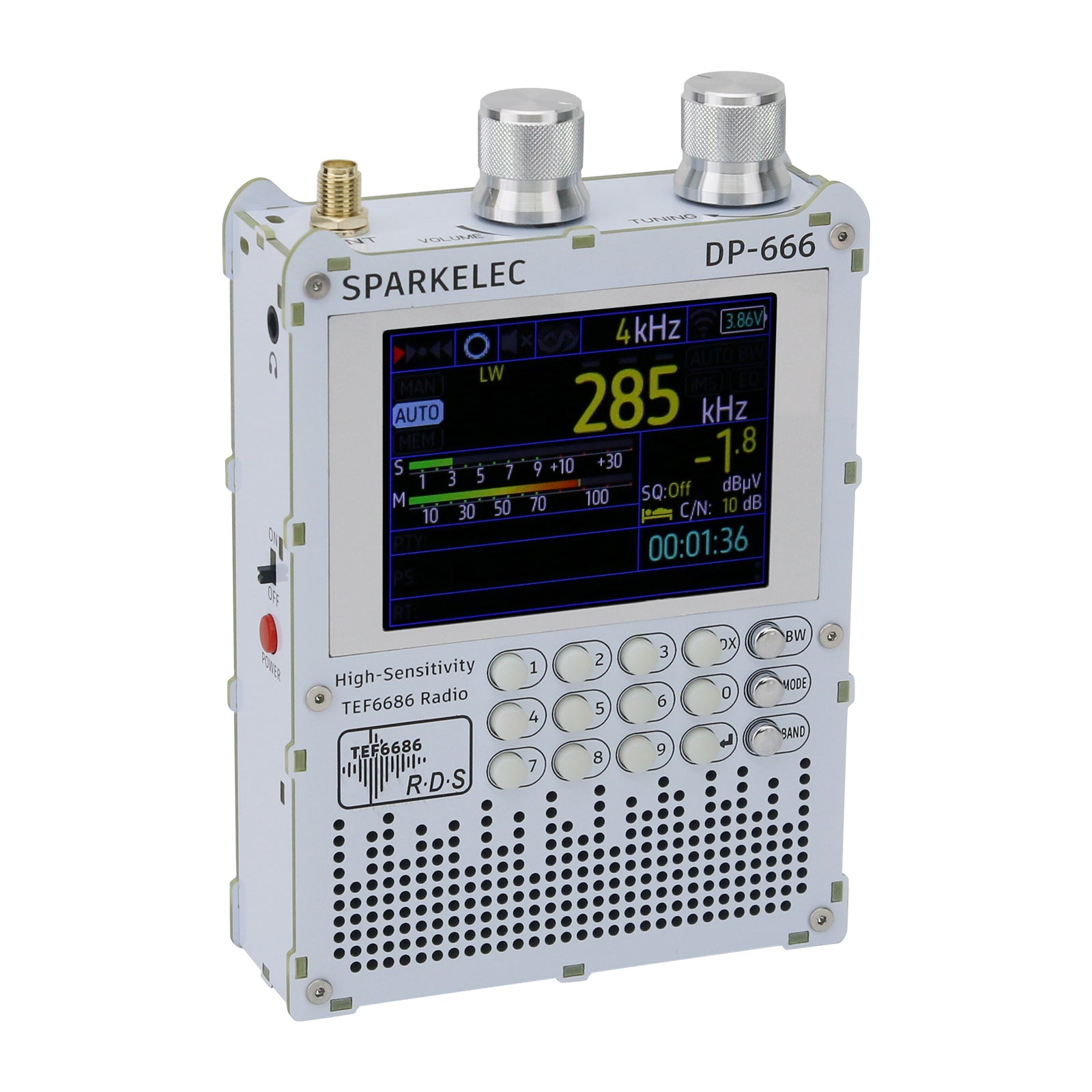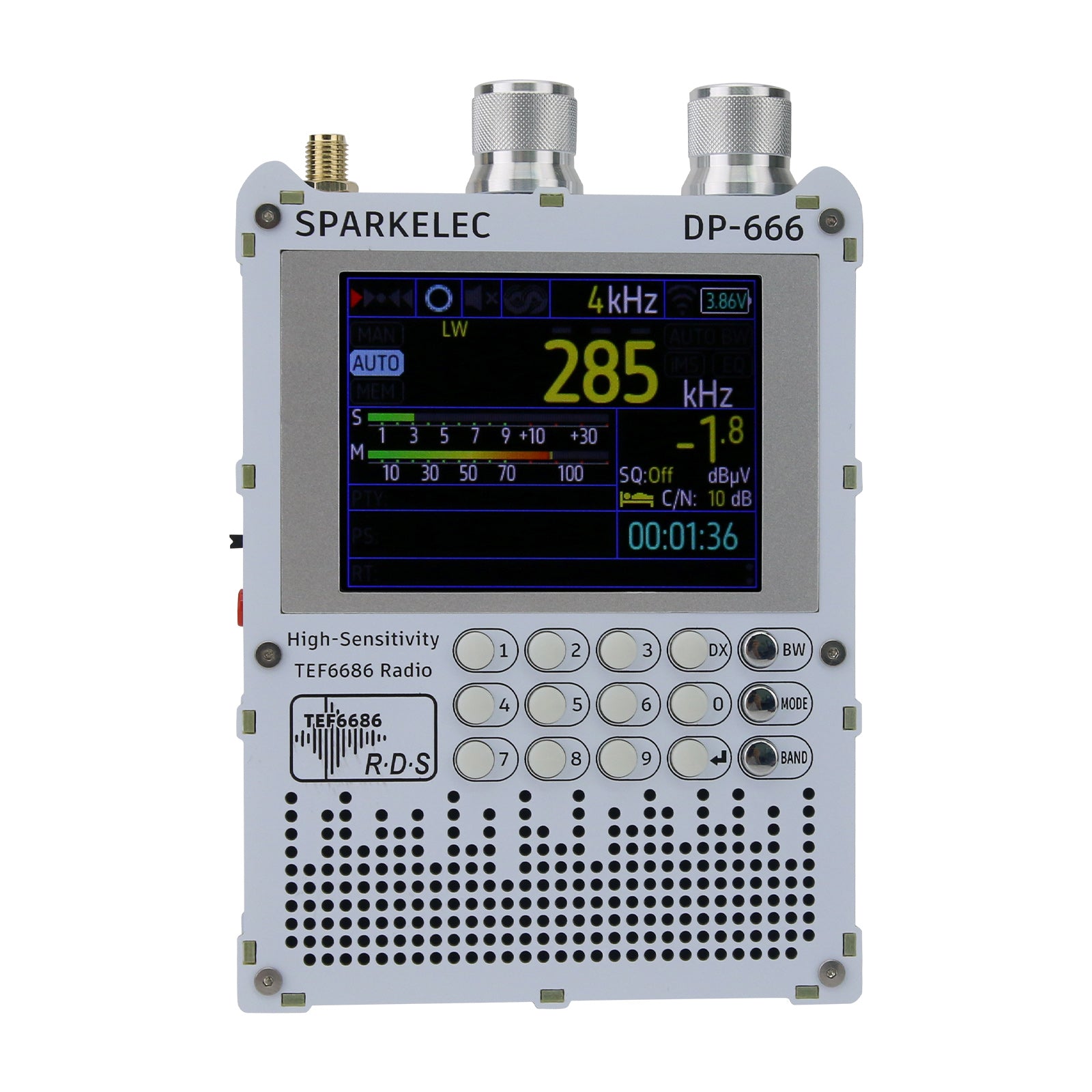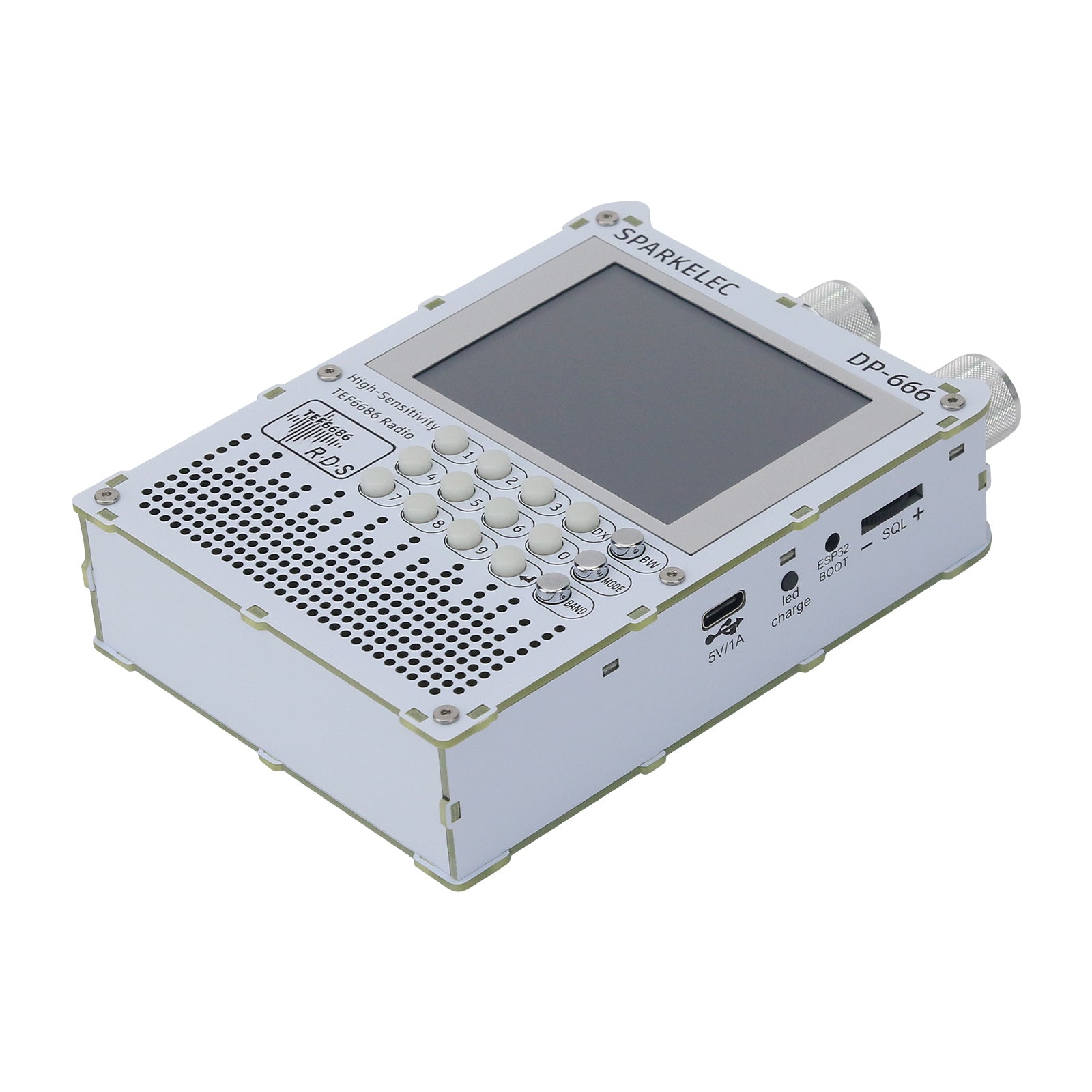- DP-666 is a high-sensitivity radio based on NXP's high-performance automotive-grade TEF6686 chip, which has excellent selectivity and ultra-high sensitivity. This automotive DSP tuner has a wide range of functions and advanced algorithms (CEQ, EMS, iMS and PACS, noise canceller...), SDR(software-defined radio) signal processing, especially for improvement of multipath, adjacent frequency interference, weak signals There are significant advantages in processing and noise cancellation. DP-666 is a radio built on PE5PVB's open source project TEF6686_ESP32. In addition to listening to radio stations, the project also supports a wealth of advanced features, such as: almost all RDS (Radio Data System) data display, automatic/manual station scanning, squelch function, battery voltage display, changeable themes, multilingual, station presets, and more. We redesigned the circuit board with reference to the mature TEF6686 front-end receiving circuit, and equipped the DP-666 with a 2.8-inch LCD color screen with resistive touch based on the open source project. While ensuring the portability of the machine, it can display rich RDS information (RDS information requires local radio support); a numeric keypad is added to facilitate users to quickly input frequencies; and a large-capacity 5000mAH battery supports longer standby time. In short, I hope you will be satisfied with this portable high-sensitivity travel radio! As the firmware is still under development and new features will be introduced, this manual is bound to have omissions and errors. Please understand.
