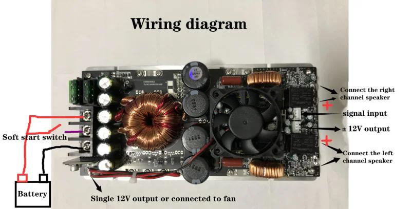 - It is powered by a 10-14.4V battery and comes with dynamic voltage stabilization. The power will not be reduced due to the reduction of battery power. The power supply voltage will not be reduced when it is fully loaded, achieving constant power output. The power amplifier comes with a low voltage of 9.8V battery, for a high voltage of 16V battery, it will automatically shuts down.