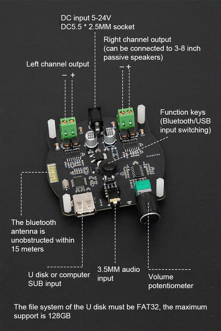 - Audio input: AXU/PC/USB Flash Drive/Bluetooth