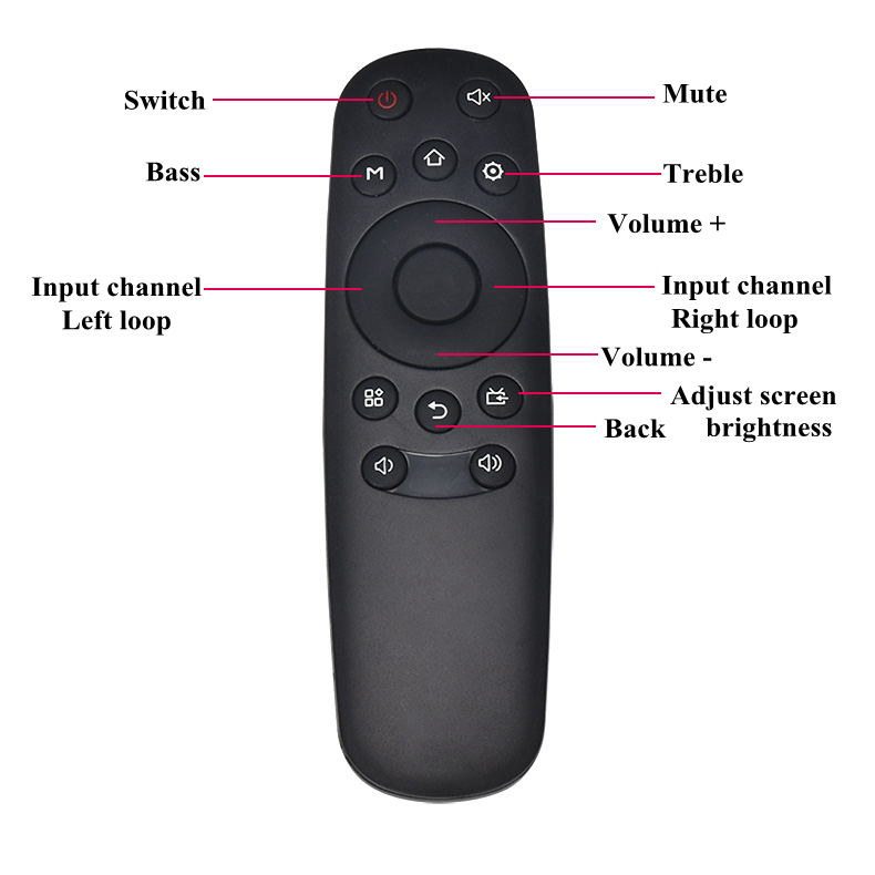 - Infrared remote control. You can just stay in sofa, or in bed. With the remote control, you can control volume, switch signal, adjust treble and bass, screen brightness, make it standby or power on.