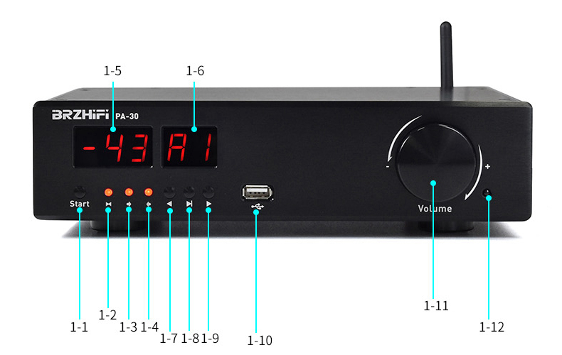 1-11 Multi-function knob (Rotate to adjust volume. Short press to select signal channels. Long press to adjust treble and bass)