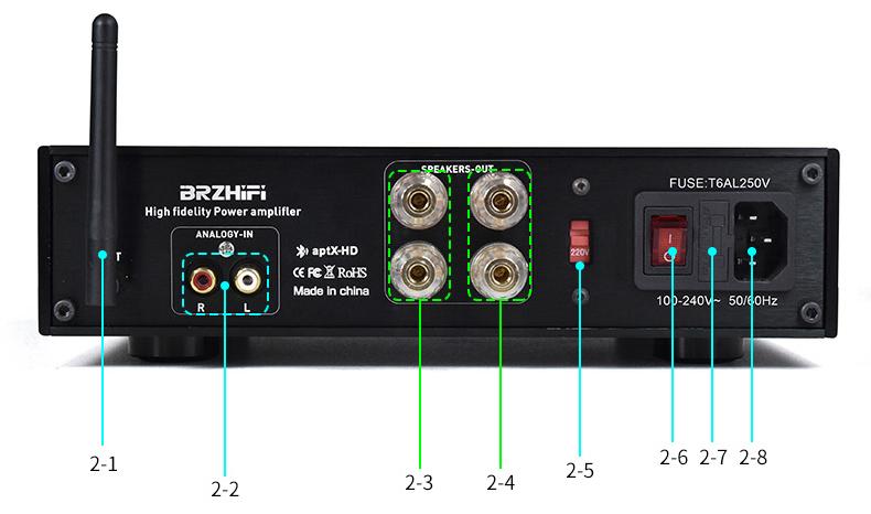 1-6 Signal channel indication (A1: RCA input channel. A2: U disk channel. B1: Bluetooth channel)