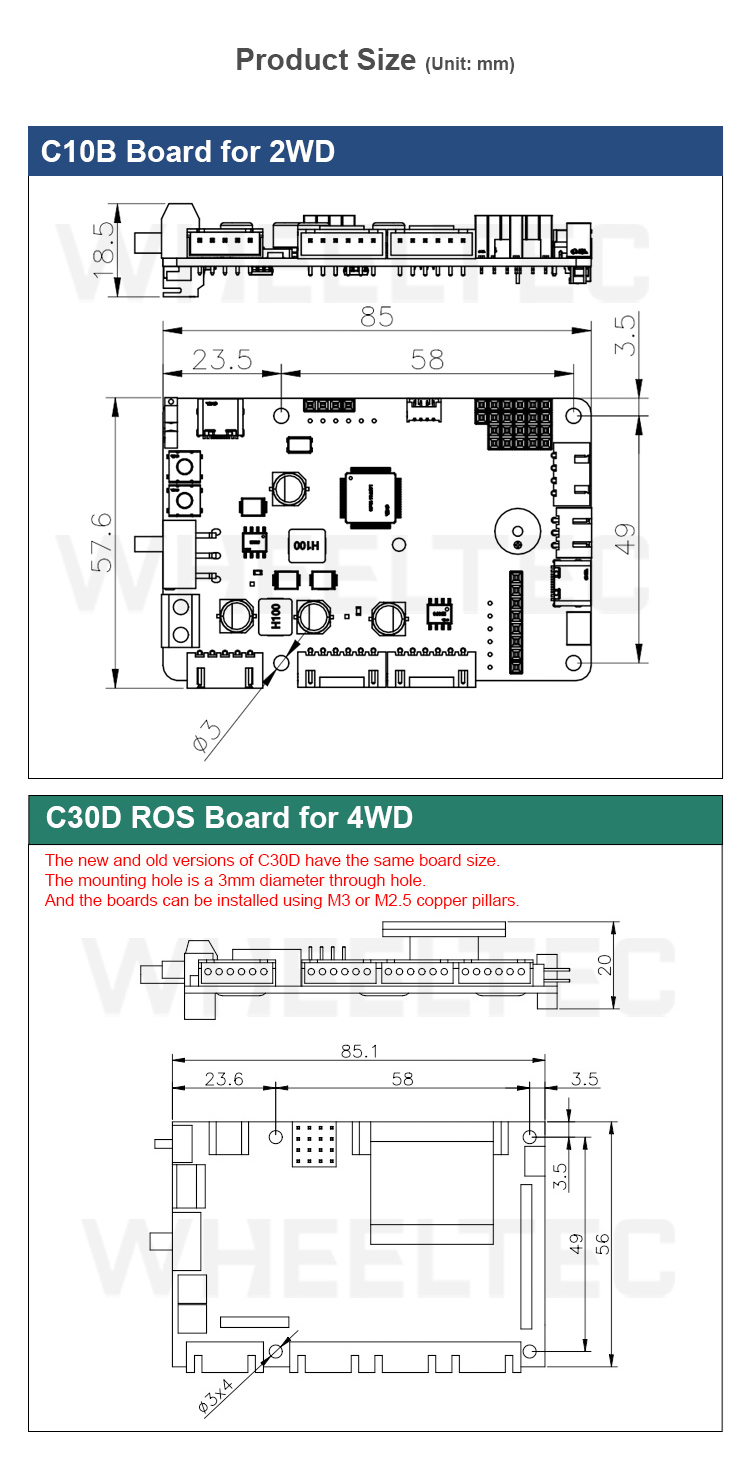 The C10B and C30D master controllers are designed based on smart cars and ROS scenarios. They are applicable to various chassis structures. The industrial-grade 4-layer circuit boards and meticulous circuit design make them more reliable in use. The main-boards can communicate with the outside world via serial ports and CAN, and corresponding code and tutorials are provided. They offer a 5V 5A interface to supply power to various development boards (for ARM) such as Raspberry Pi, Jetson Nano, and LubanCat. The code and schematic diagrams are open-sourced.