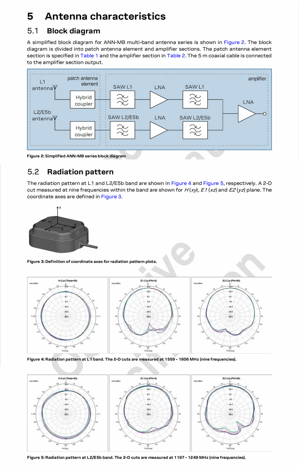 The ANN-MB series includes a high-performance multi-band RHCP dual-feed patch antenna element, a built-in high-gain LNA with SAW pre-filtering, and a 5m antenna cable with three connector options (SMA, SMB, MCX).