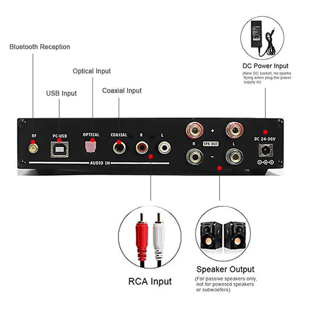 - USB Coaxial Optical AUX Bluetooth Input: Support 192K/24Bit. SNR ≥ 105 dB and THD< 0.01% . Stereo Sound without distortion.