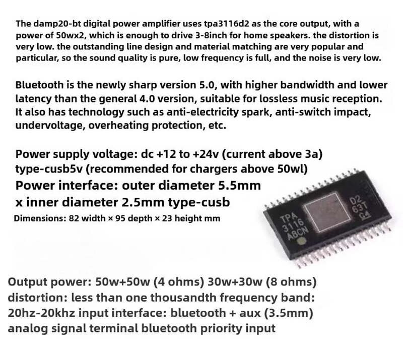 - The DAMP20-BT digital amplifier uses TPA3116D2 as the core output, with a power of 50Wx2, which is sufficient to drive 3-8 inches home speakers. The distortion is very low, and the excellent circuit design and material matching are very stylish and exquisite. Therefore, the sound quality is pure, low-frequency, full, and the noise is very low.
