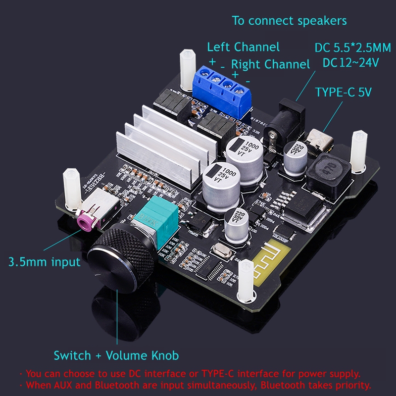 - Input interface: Bluetooth + AUX (3.5mm) analog signal terminal, Bluetooth priority input