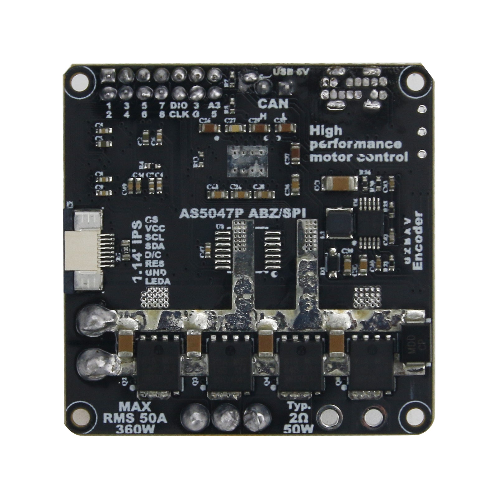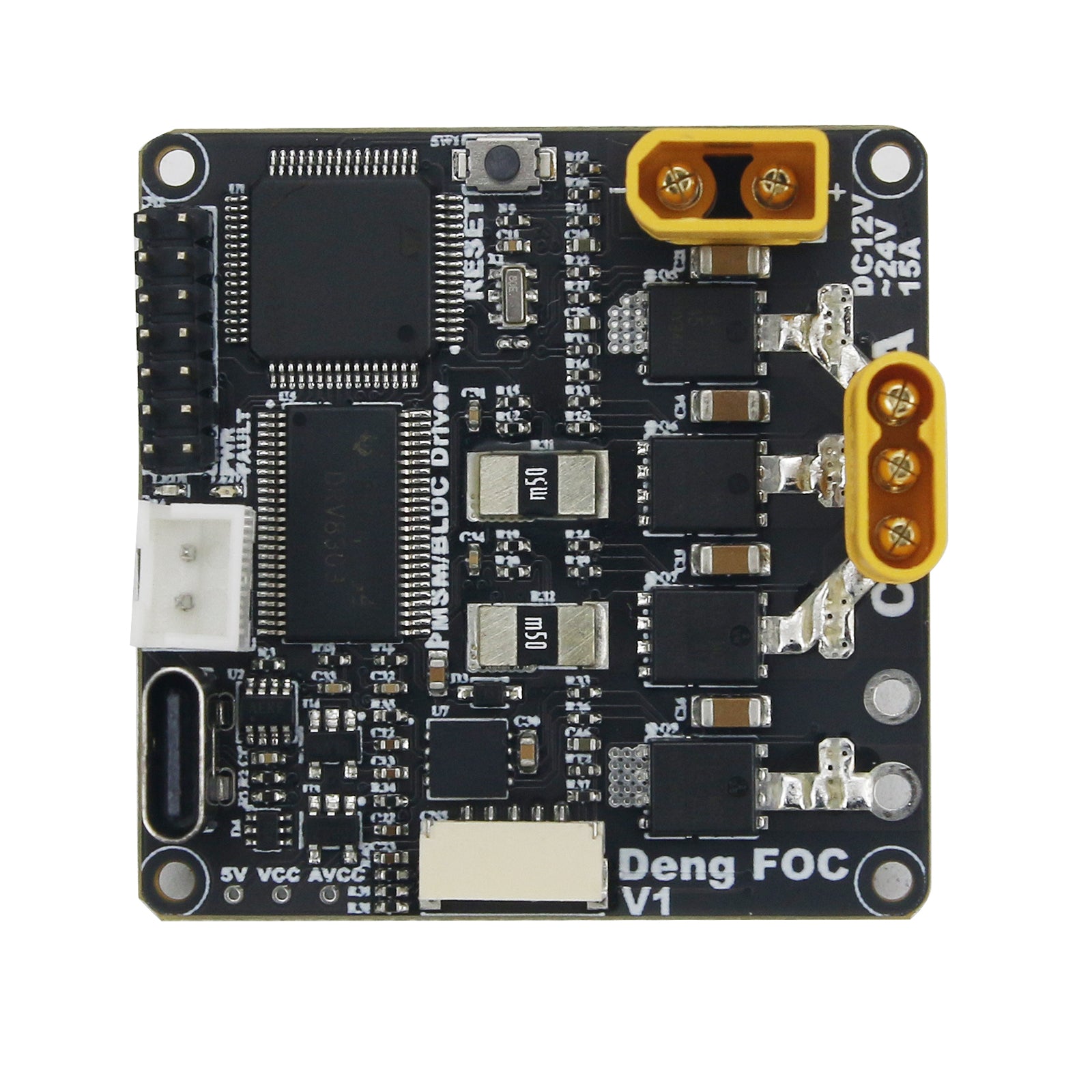 Deng FOC, a highly integrated FOC driver, is suitable for three-phase brushless DC motors and permanent magnet synchronous motors. Based on the powerful and stable open source project O Drive, we optimized the circuit, reduced the size, and optimized the interface to improve the expandability of the driver. Deng FOC driver supports driving high-current motors, and can realize closed-loop control of FOC position, speed, and torque. The encoder supports ABZ mode and SPI mode (onboard), which can detect the temperature of the drive in real time. Further more, Deng FOC reserves a variety of interfaces, including USB, CAN, GPIO expansion, and FPC serial port (which can realize screen display or wireless control), allowing users to develop freely. More importantly, we also further reduce costs and are committed to creating the most cost-effective FOC motor driver.