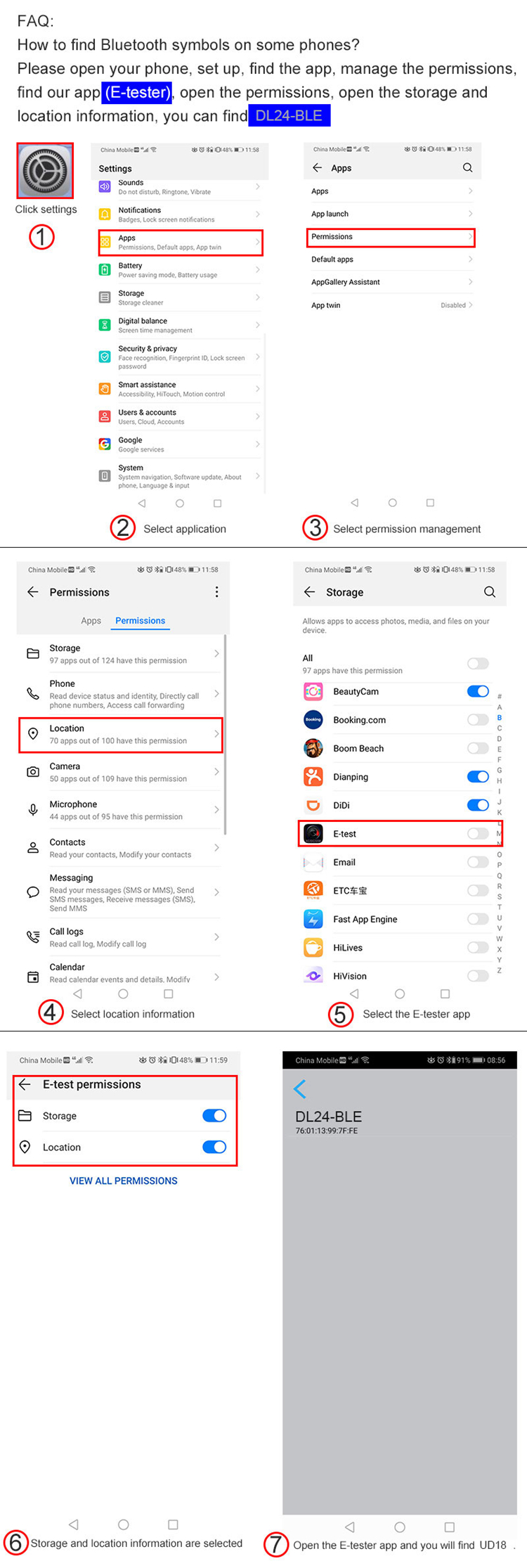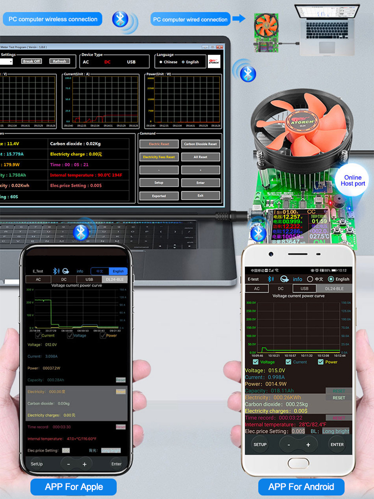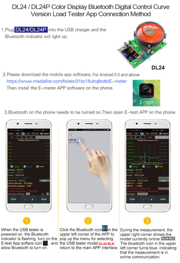 Please search for E_test in application store to download and install, then click Bluetooth APP icon to open the software, and then click Bluetooth icon above the software to enter to select DL24-BLE to connect, you can achieve mobile phone remote wireless remote control settings and measurement function. Discharge status can be viewed at any time on your mobile phone, various data cleaning is visible, the voltage and current power curve of the discharge, etc. can be checked. No Bluetooth pairing is required.