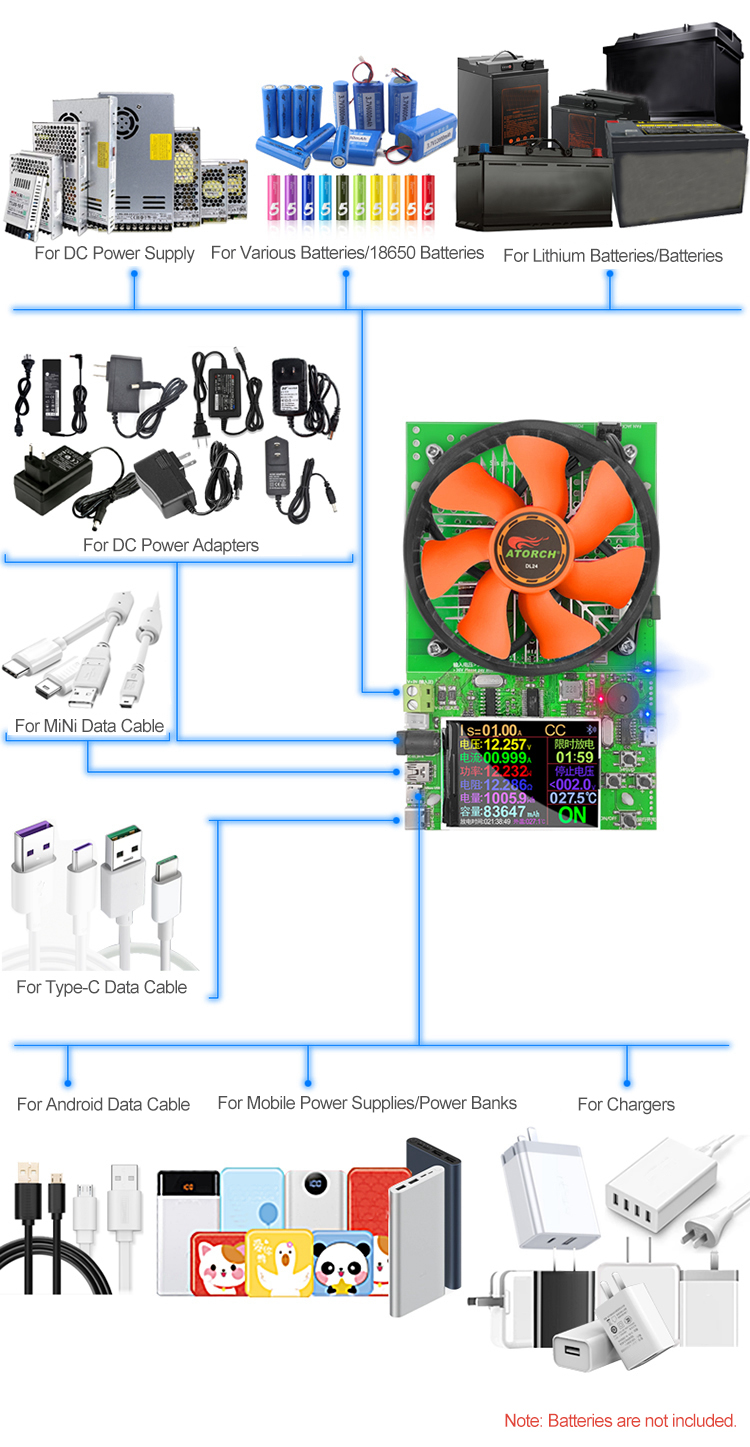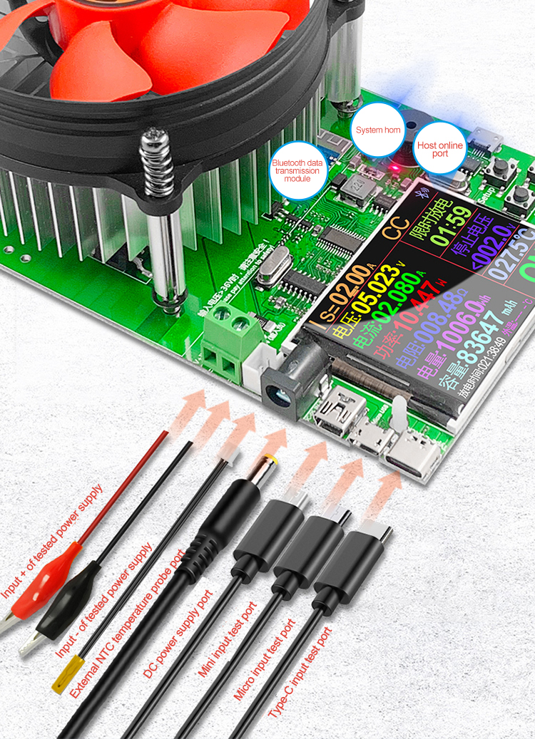 Suitable for various USB chargers, mobile power banks, battery and battery capacity, power adapters and other power supply equipment, used to measure parameters, including voltage, current, power, capacity, power, temperature, discharge resistance, limited time discharge settings, stop voltage settings and operations.