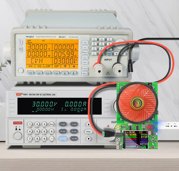 Test the current, voltage, power and other parameters of DC power adapter. Use the DC power supply to connect the DC independent power supply port of load meter. The connection method is shown below. Then, by setup button to precisely adjust the current, the voltage and current of tested power supply. DC power supply can also be aged for a long time. Powerful function, simple operation and convenient test.