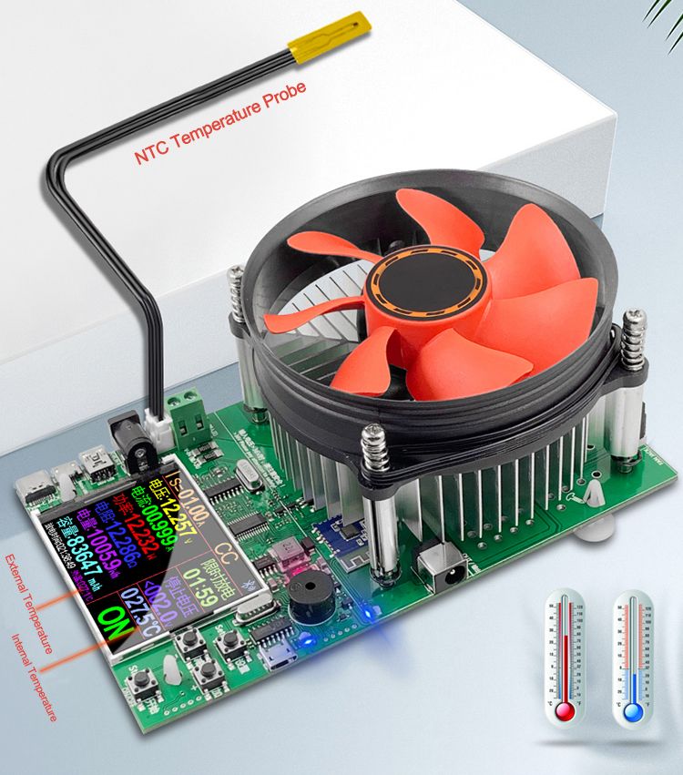 With external wired NTC temperature probe to achieve internal and external temperature measurement. Can test external temperature, such as power bank temperature, charger temperature, body temperature and water temperature. Test internal temperature, such as the temperature inside the load machine. At the same time of discharge detection, there are overload protection, over-current protection, high temperature protection, real-time monitoring of the state of discharge tube. Safe and reliable to use.