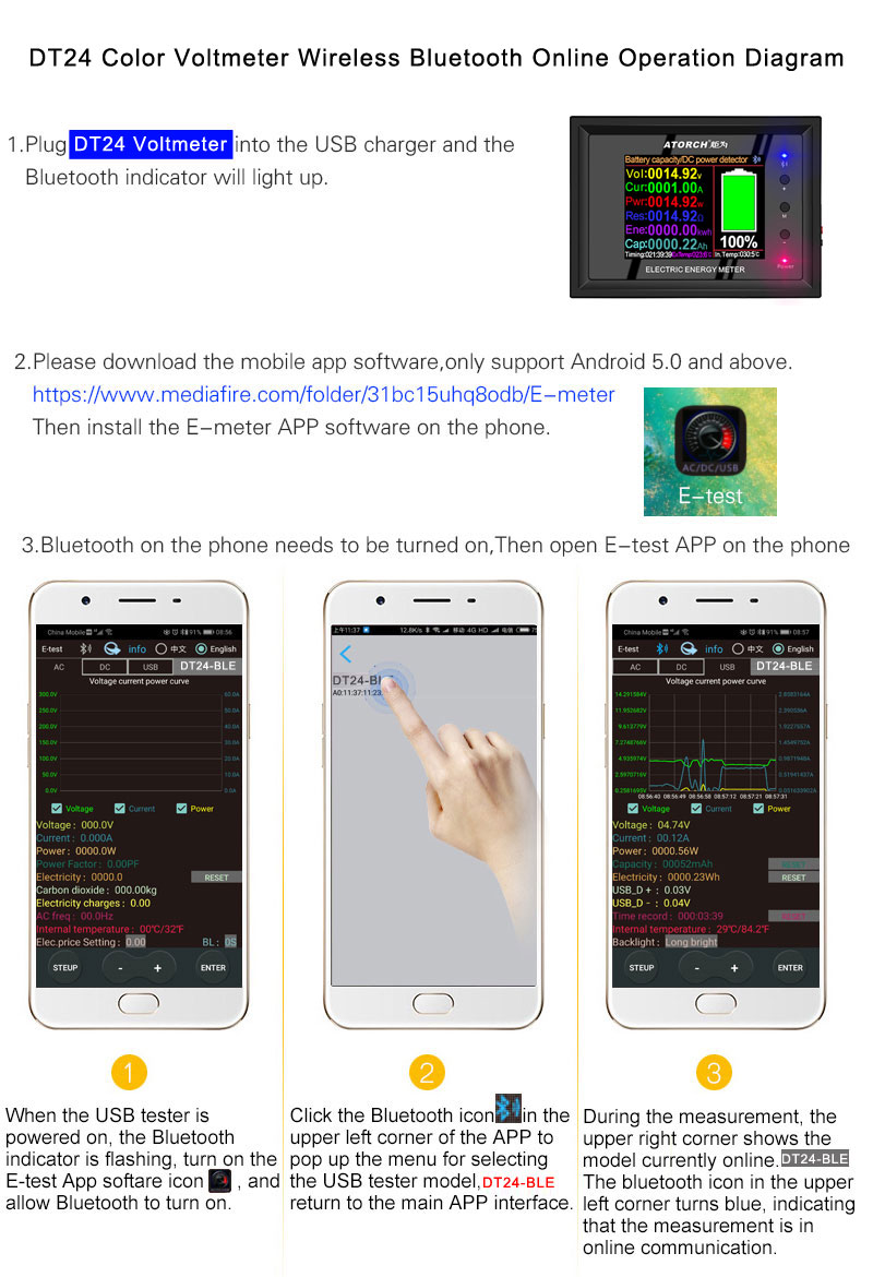 ① For Apple Mobile Phone: Please search E_test directly in the application store to download and install, and then click Bluetooth APP icon to open the software, click the Bluetooth icon at the top of the software to enter DL24-BLE to connect, you can achieve remote control settings and measurement functions of the mobile phone. The discharge status can be checked at any time on the mobile phone, various data, discharge voltage, current, power, curve, etc. are clearly visible.