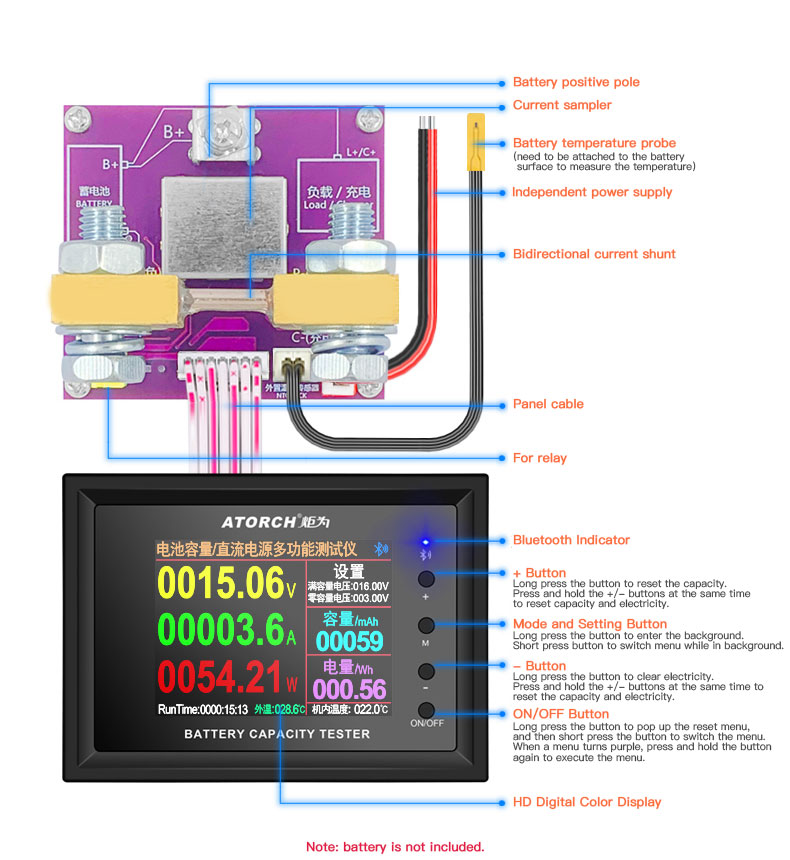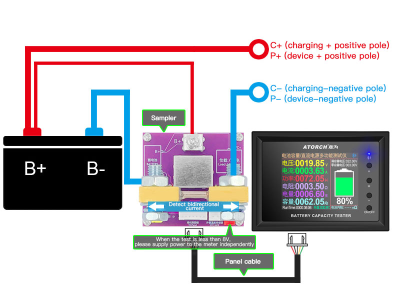 - Wiring is simple and easy to retrofit. Whether your battery is lead-acid, ternary lithium battery, or lithium iron phosphate, or other types of batteries, when connected as shown in the figure below, as long as the battery is 8~240V, it can be used. (If you want to test batteries or power supplies less than 8V, please supply 9V to the independent power supply interface)