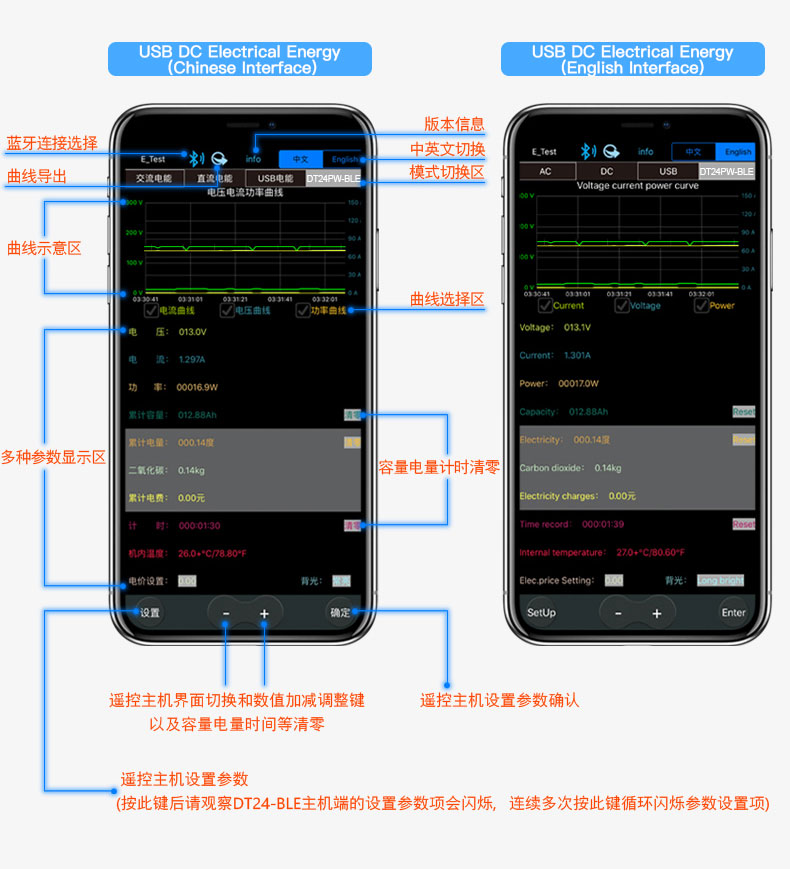 1. Phone APP for Apple: Please directly search for E_TEST in the app store to download and install, and then click the Bluetooth APP icon. After opening the software, click the Bluetooth icon at the top of the software to enter and select DT24PW-BLE to connect. In this way, the remote control setting and measurement functions of the mobile phone can be realized. Through the mobile phone, the user can check the discharge state, the voltage, current and power curve of the discharge at any time (no need for separate Bluetooth pairing, the software Bluetooth icon can directly select DT24PW)