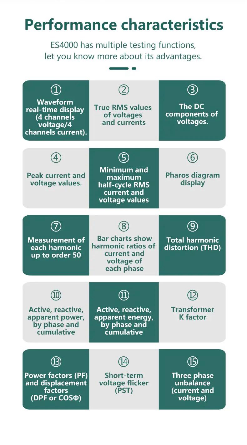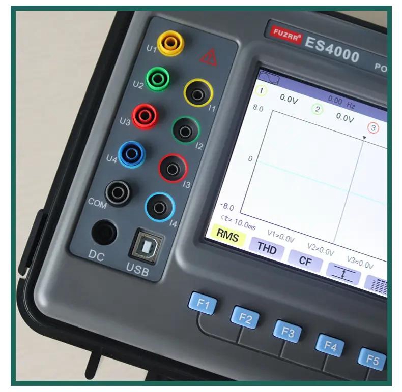 - ES4000 Power Quality Analyzer is a comprehensive test instrument carefully developed by our company and specially designed for field test of three phases, multi-functional and intelligent, concise man-machine operation. It is easy to use, large LCD screen display, high resolution, interface in both Chinese and English, shock-proof shell structure and so on. Can simultaneously measure the 4-channel current (ABC three phase and neutral wire current), 4-channel voltage (ABC three-phase voltage and neutral line voltage to ground), the peak value of current voltage, maximum/minimum value over a period, three-phase imbalance factor, short-time voltage flicker, transformer K factor, active power, reactive power, apparent power, power factor and displacement power factor, active power, reactive power, apparent power, total harmonic distortion and harmonic, etc; Display real-time waveform, harmonic ratio bar charts of current voltage; Dynamically capture instantaneous change of voltage current, monitoring starting current, monitoring the power parameters and generate the alarm list, generate the trend chart for a long time record test data.