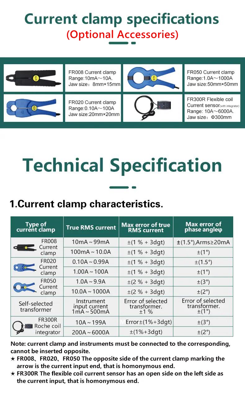 - FR008/FR050/FR020 clamp and FR300R flexible coil current are not included, please contact our customer service for additional purchase.