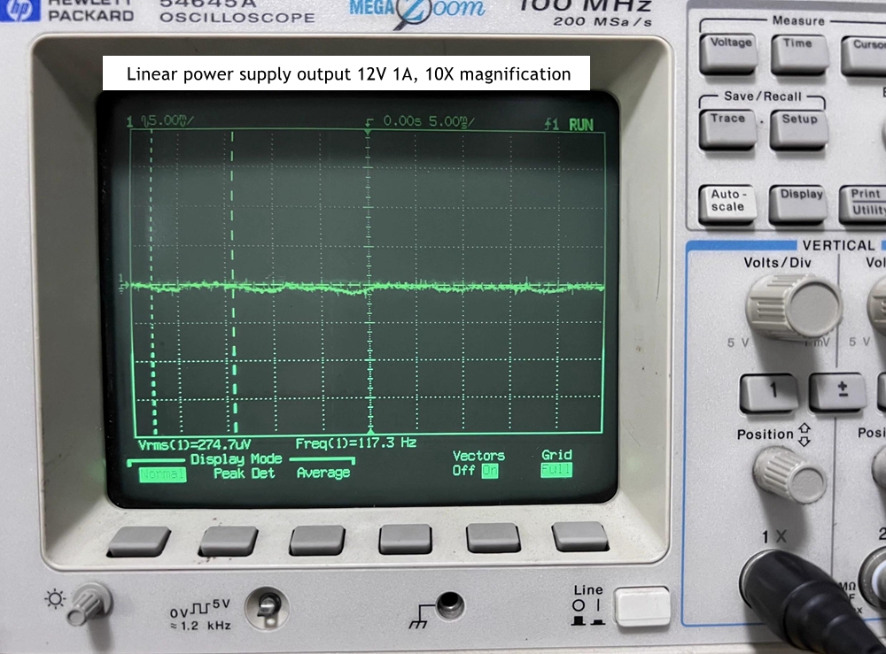 - The voltage stabilization circuit adopts precision low-noise operational amplifier servo stabilization and high current transistor expansion design, greatly reducing the output ripple of the power supply. When tested to output 1A current at +12V, the ripple is only 80-100uV, which is 1/10 of the original switching power supply (the ripple of the original switching power supply was 1.5mV).