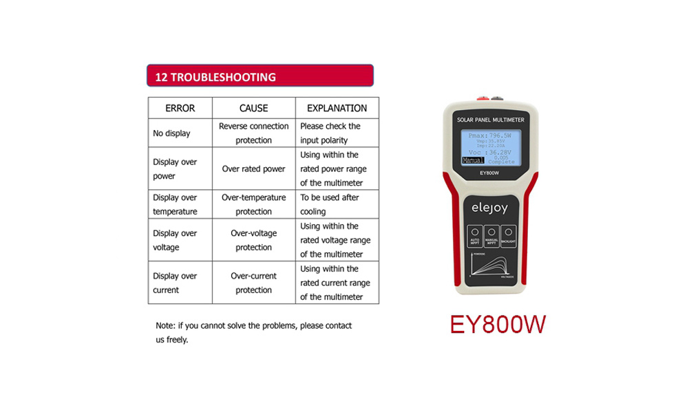 EY800W Solar Panel Multimeter 5-800W Solar Panel Tester Backlit LCD Automatic Manual MPPT Detection