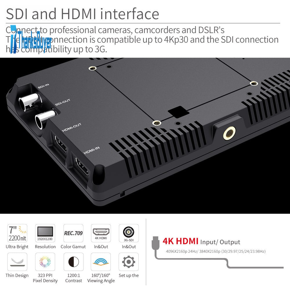 Includes 4K HDMI and 3G-SDI, you can connect any DSLR, prosumer or professional camera. The HDMI connection is compatible up to 4Kp30. You can monitor audio using the 3.5mm stereo headphone jack, or the built in speaker.