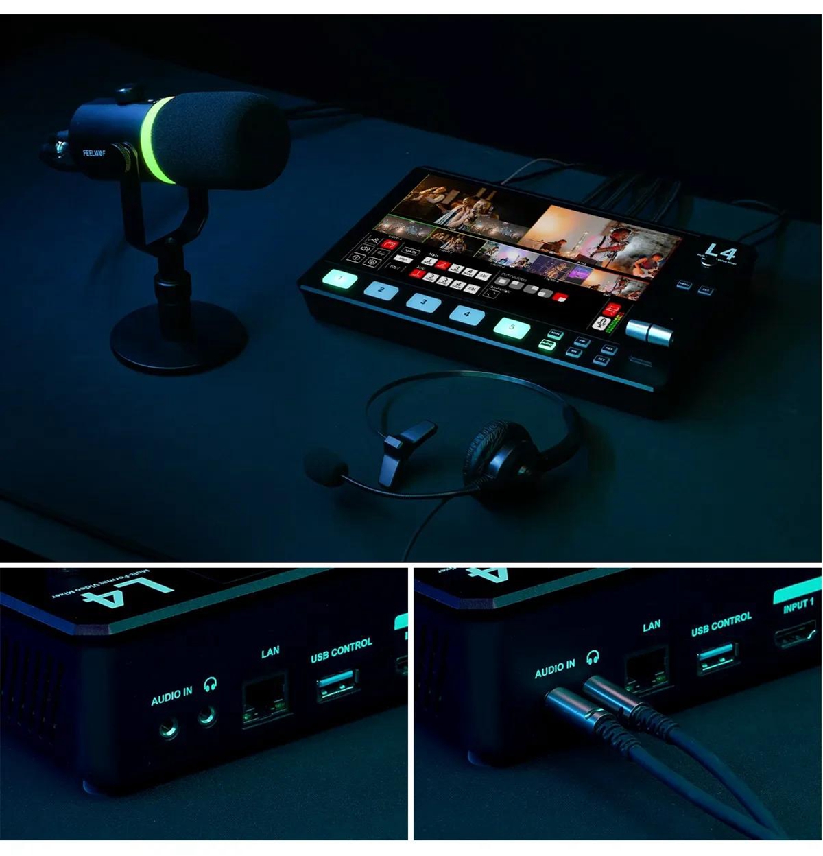 - Supports 2 channel mixing: With 3.5mm stereo audio input, you can connect the microphone to the L4 switching station, and all audio inputs can be displayed in real-time on the screen for better understanding of audio status. L4 also provides a standard 3.5mm audio output interface, and you can use an external speaker or headphones to monitor the main output audio signal of L4 in real-time. In addition, L4 also supports 2 channel mixing.