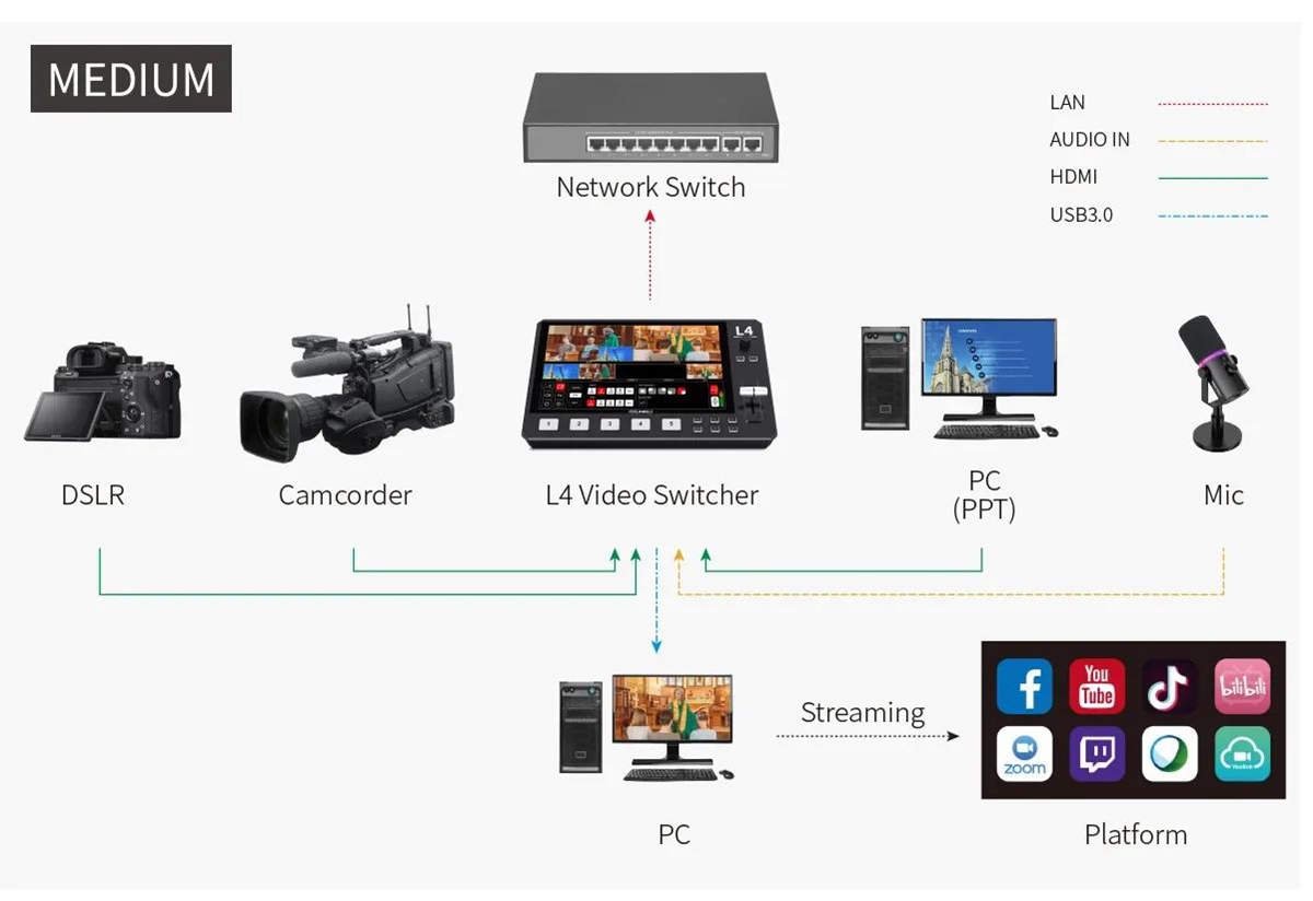 - The L4 features a USB 3.0 connection that operates as a simple webcam source. It can connect to any computer, so all streaming software for social media platforms work! Such as OBS software for live streaming, or conference software (for Skype, ZOOM, Tencent conference and Yealink) for business presentations. All switching is in real time so you can live stream to any social media platform for Youtube, Facebook, Tik Tok, Douyu TV and many more!