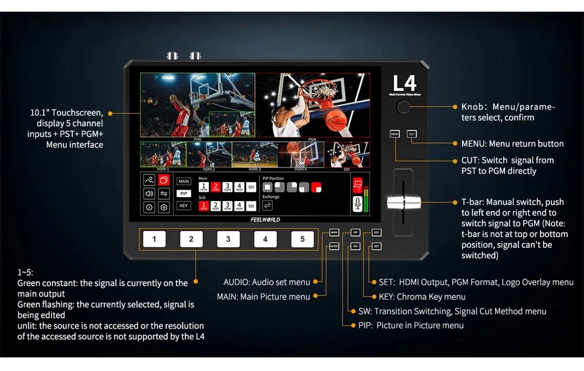 FEELWORLD L4 Video Switcher 10.1-inch LCD Touch Screen Video Mixer USB3.0 High Speed Live Streaming