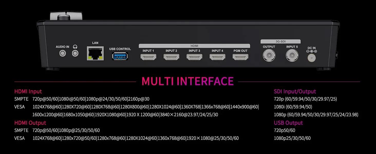 1. Multi-cam connecting: L4 with 4 HDMI-compatible and 1 SDI, ideal for medium or large multi-cam live streaming. For medium live streaming, you can use 2 to 3 cameras, collect a close-up or panorama of different view, you can also connect PC to play PPT; for large live streaming, you can use 3 to 5 cameras, can also connect PC to play PPT or connect PTZ controller. All of pictures can be quickly switching via T-bar and buttons.