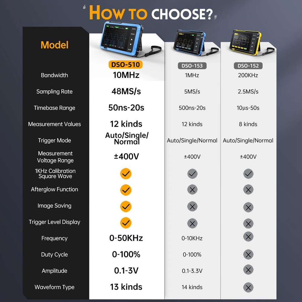 - The DSO510 is a powerful oscilloscope, offering advanced performance suitable for complex signal testing, research, and development. This model is an excellent choice for professionals handling intricate repairs or education environments requiring precise measurements.