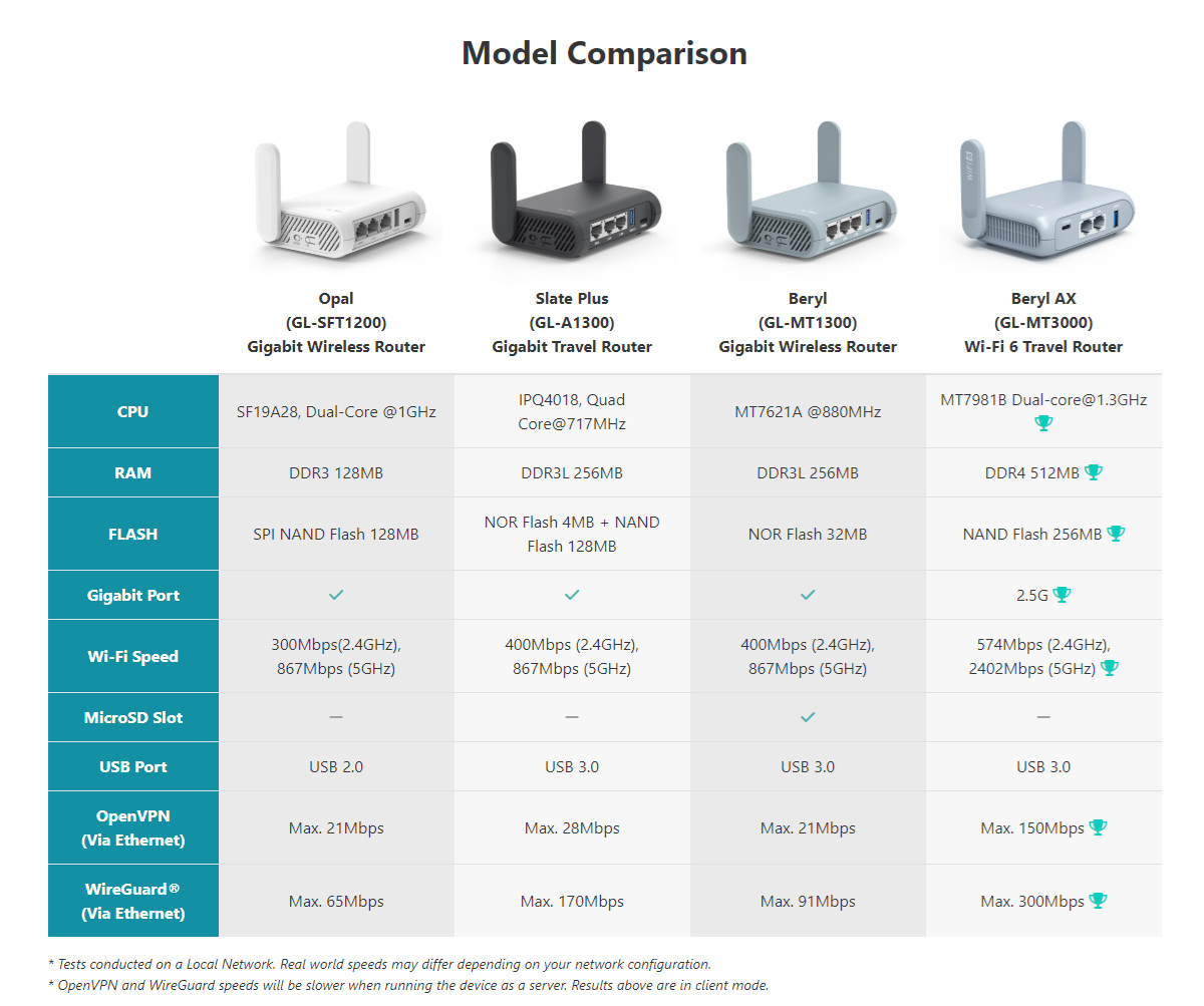* OpenVPN and WireGuard speeds will be slower when running the device as a server. Results above are in client mode.