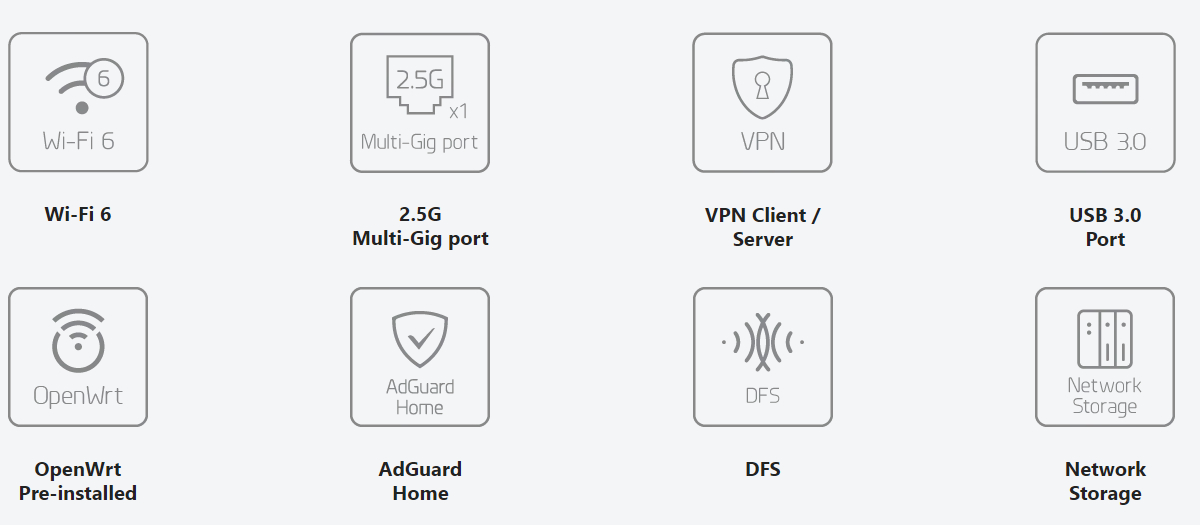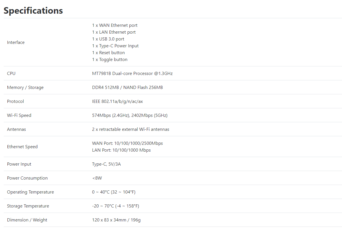 * Beryl AX comes with a 2.5G Multi-gigabit WAN port and a 1G gigabit LAN port, it is capable of processing network and VPN packets efficiently using its MediaTek MT7981B 1.3GHz Dual-core processor. The router also comes with a Type-C power supply and a USB 3.0 port for external storage.