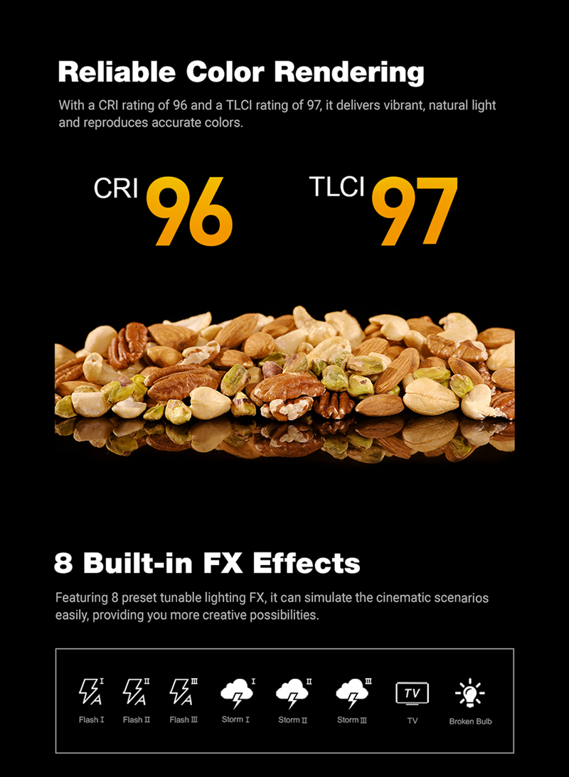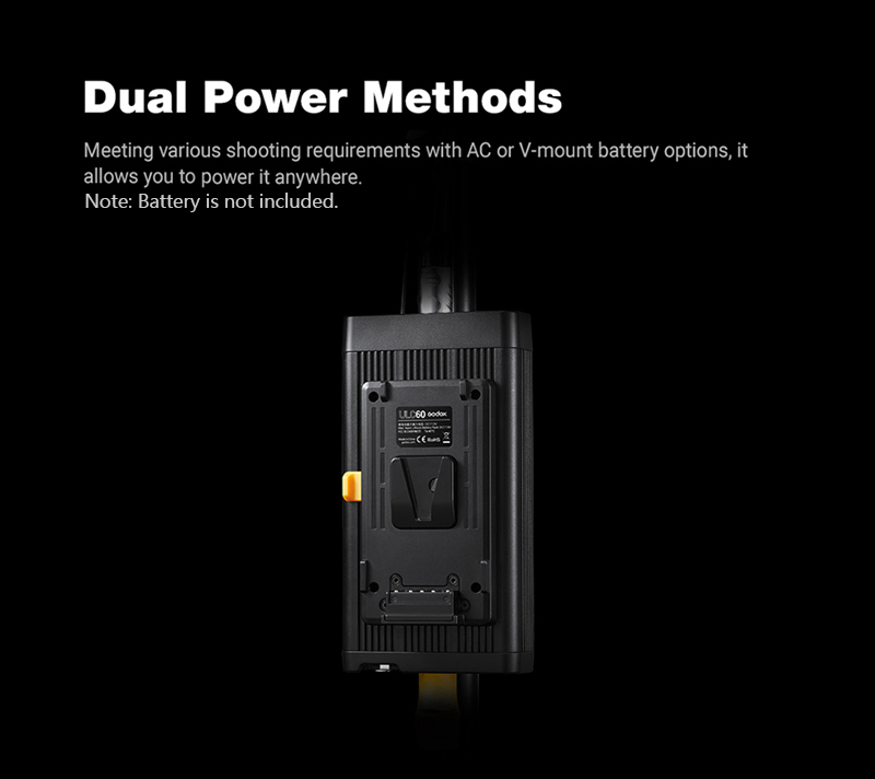 - It also can be powered by V mount lithium battery (standard voltage 14.8V) which is not included in the package.