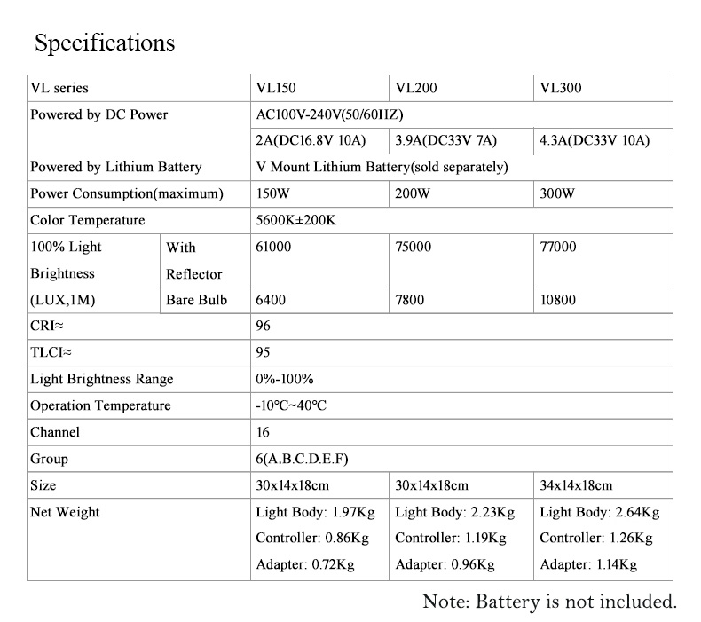 - It can be powered by V mount lithium battery (not included) or DC power supply.