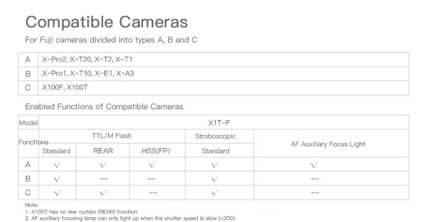 - Compatible cameras: for Fuji; support all cameras with PC output ports