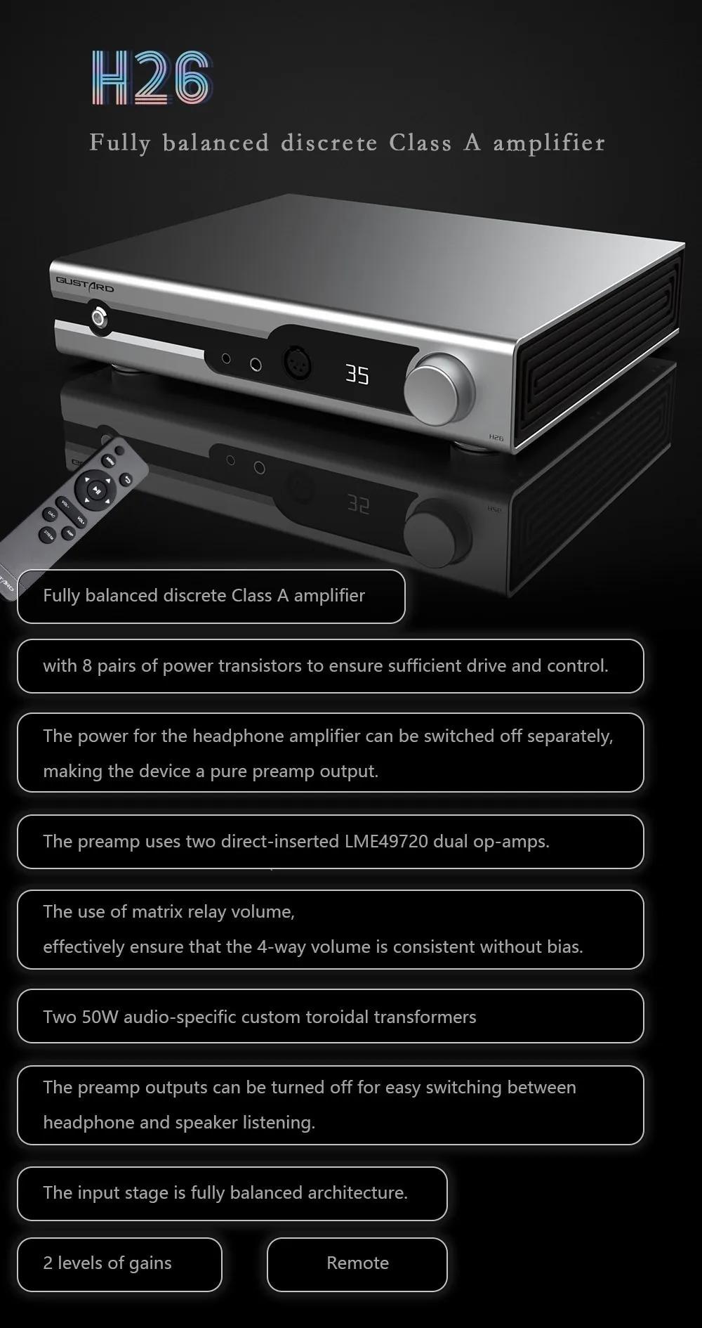 GUSTARD Black H26 Headphone Amplifier Fully Balanced Discrete Class A Preamplifier Support Remote Control