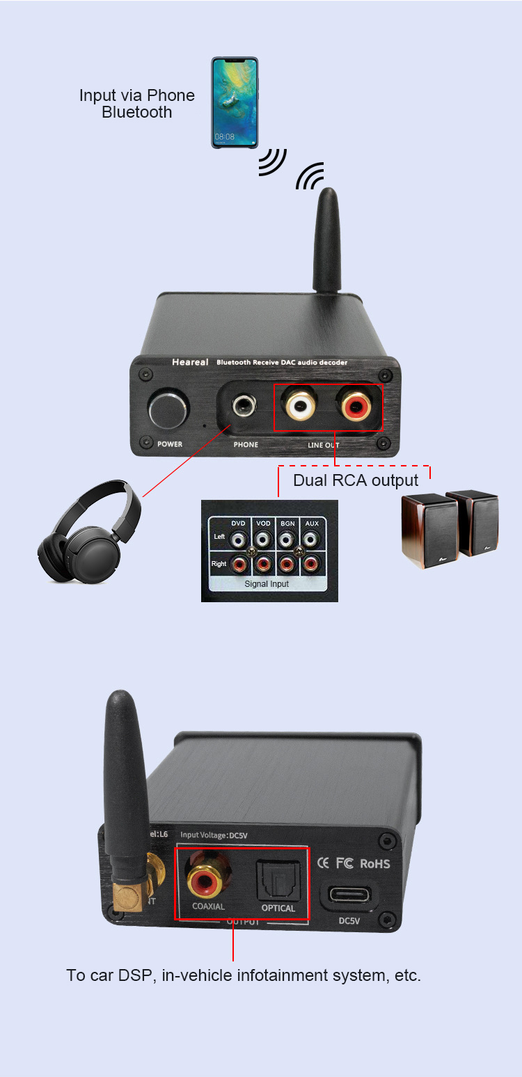 Heareal L6 Car Hifi Bluetooth Receiver DAC Audio Decoder Headphone Amp BT5.1 for LDAC/Aptx LL