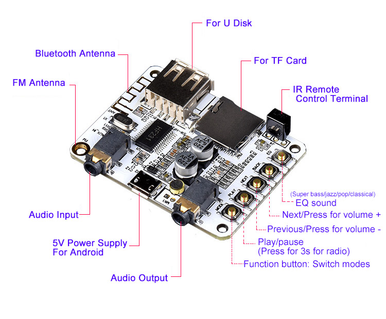 - AUX Line Audio Input: Switch playing audio sources. This interface can input audio from devices such as computers and TVs to the module. Support computer input, TV input, DVD input.