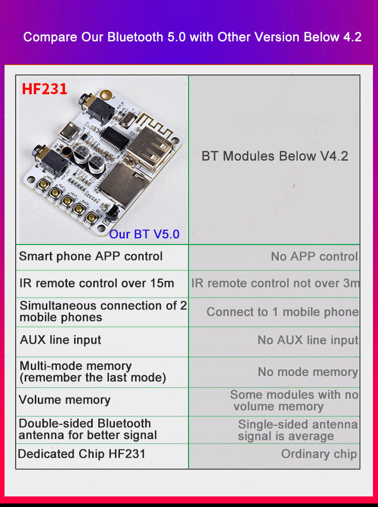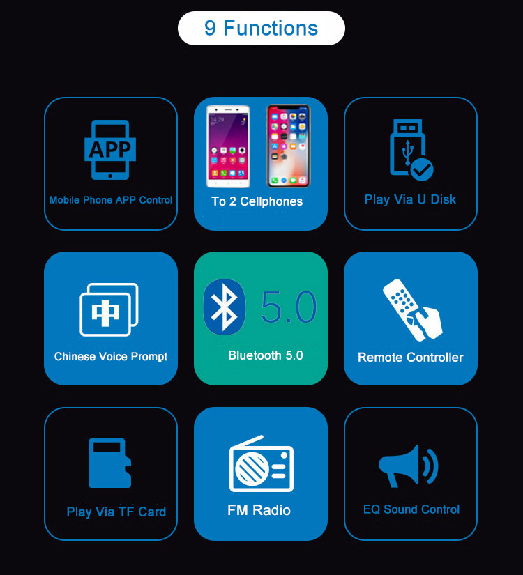 - Bluetooth 5.0 Chip: 64-bit 2.0GHz dual core. Embedded RAM & ROM. Lossless decoding of U disk and TF card. Can play music from U disk, TF card. Can connect to 2 mobile phones at the same time. Smart phone APP control. Smart mode and volume memory.