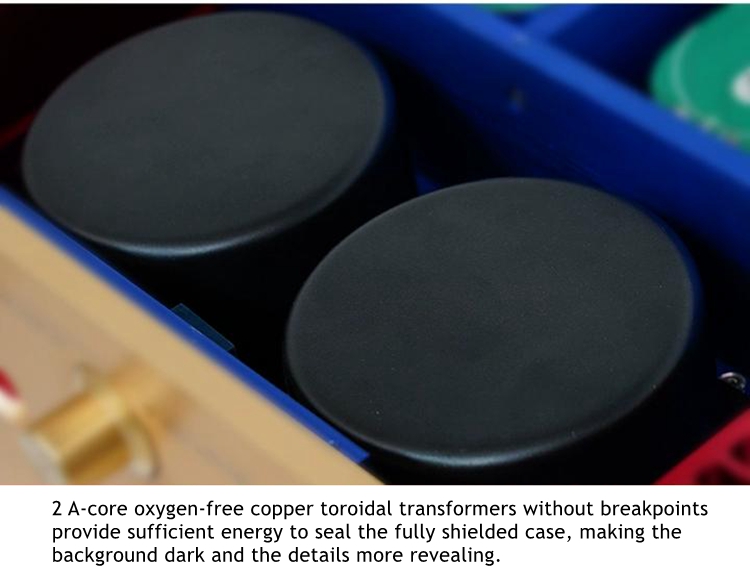 - Oxygen free copper 300W ring transformers, independent power supply for left and right channels, ensuring sufficient separation and energy.