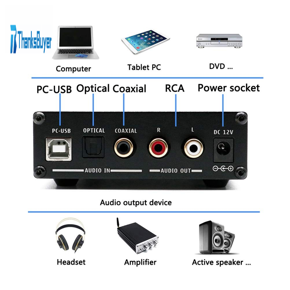 - Optical Coaxial USB Input: 24 Bit/192 kHz; RCA jack; 6.35mm headphone jack outputs. Include 6.35 to 3.5mm jack converter.