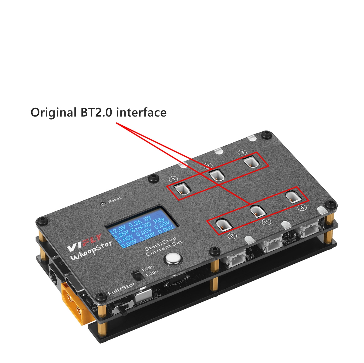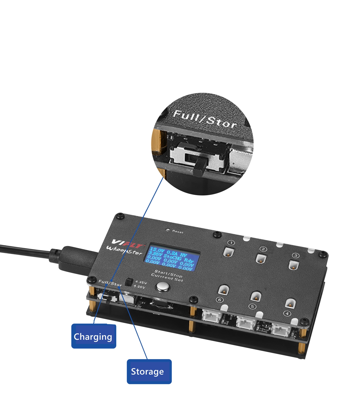 - According to the different gear you choose, the New WhoopStor can fully charge or discharge your 1S battery to the storage voltage for long-term battery storage.