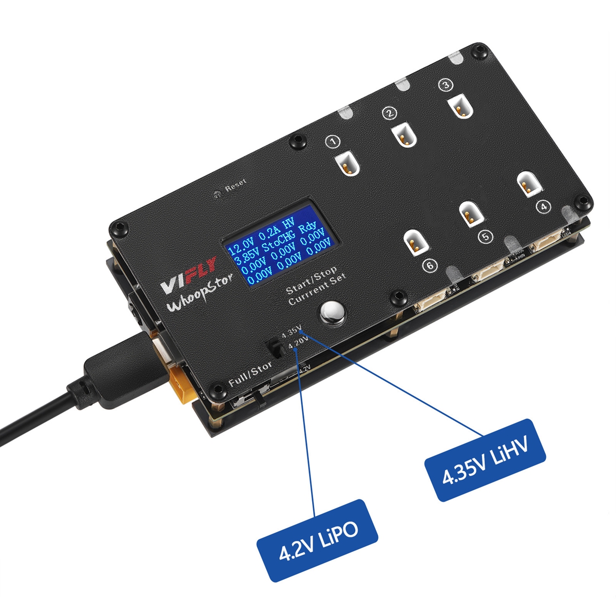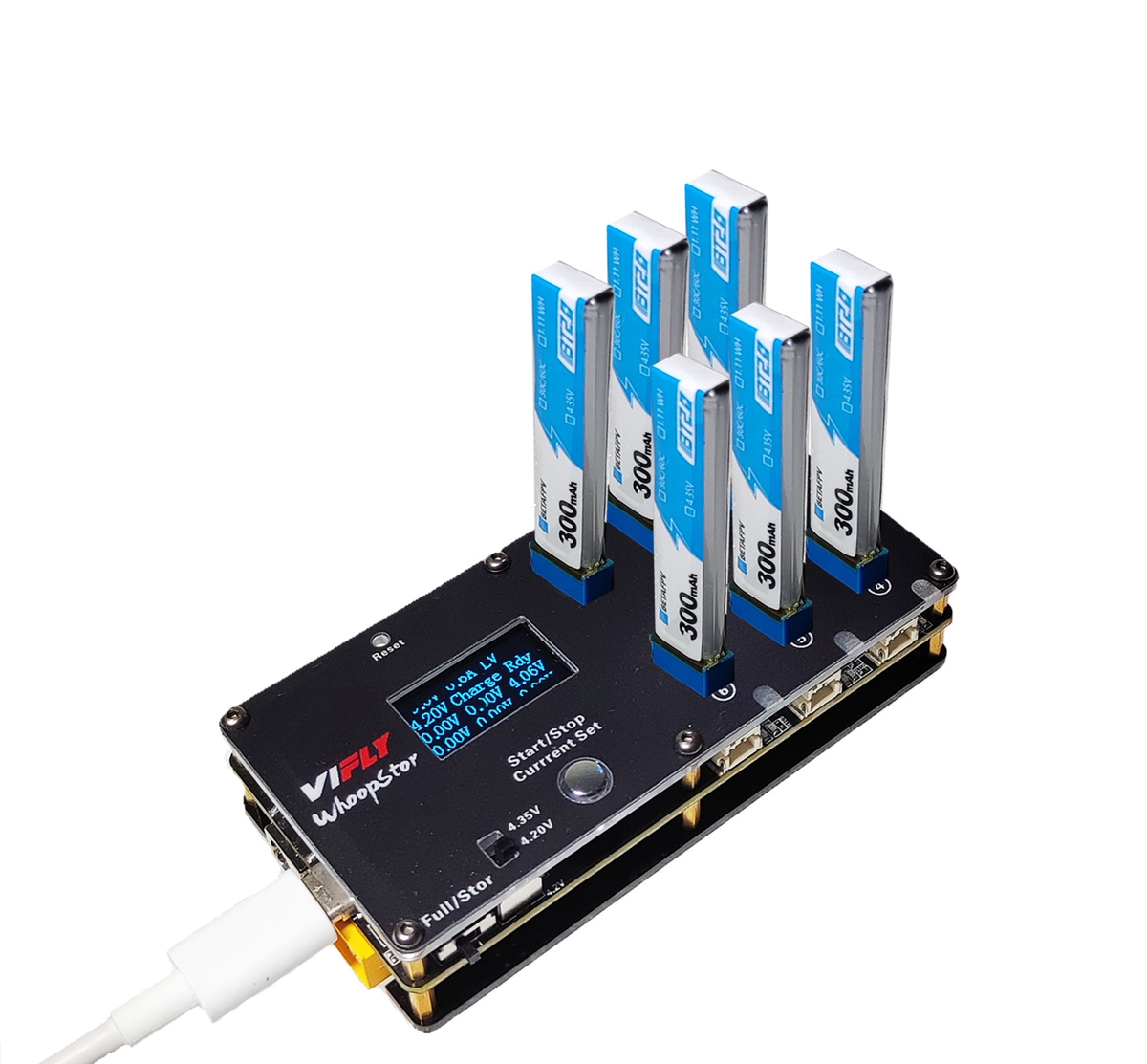 - VIFLY WhoopStor 1S charger supports both regular battery at 4.2V and high voltage battery at 4.35V. You can switch it easily with the button.