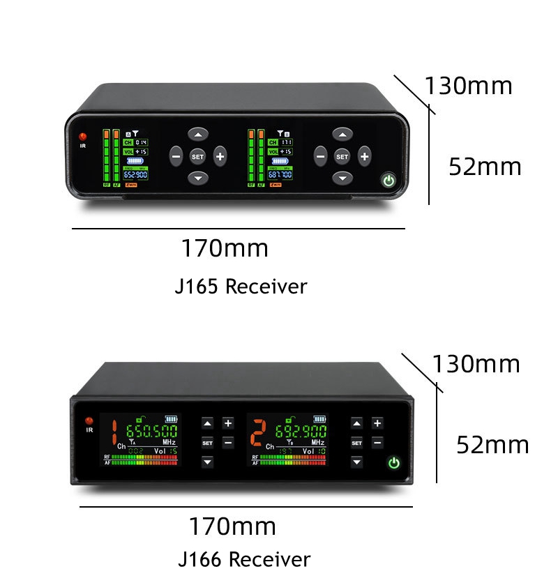 - Support automatic frequency search, automatic search for interference free frequencies, with stronger stability. Microphone frequency matching operation method: long press SET frequency matching, the receiver and microphone IR are facing each other, and the frequency point on the display screen appears a dashed box.