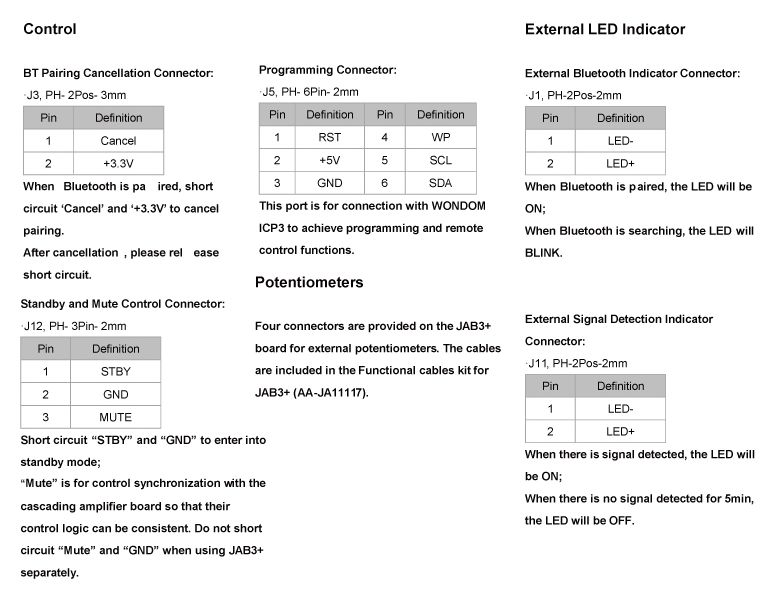- Bluetooth pairing cancellation function is integrated on JAB3+. You can disconnect with Bluetooth by one simple press, without worry about which Bluetooth is paired. Standby function is also available on JAB3+. Ports for External LED indicators are offered to show the status of Bluetooth and signal, so you can have an overview of the running condition of JAB3+.