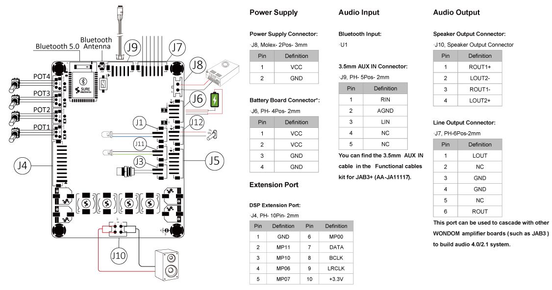 - Beside power supply, JAB3+ supports battery power, which greatly improve the portability of the systems. Please note, since JAB3+ is not equipped with charging circuit, it is recommended to use WONDOM BCPB series battery boards, which are equipped with charging circuit, to power JAB3+.