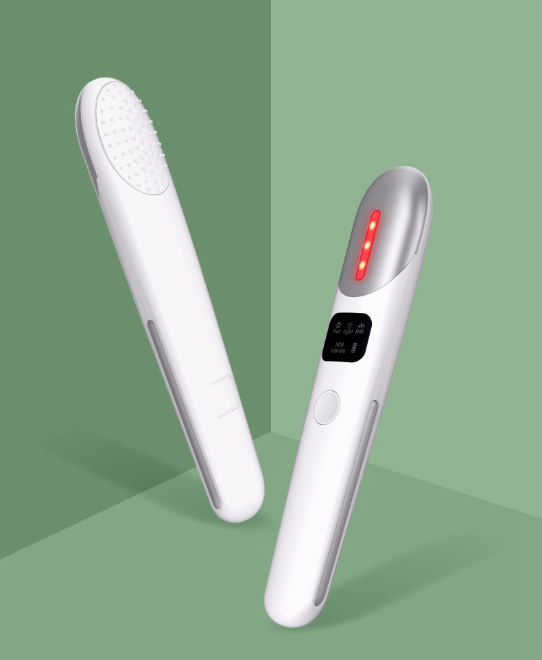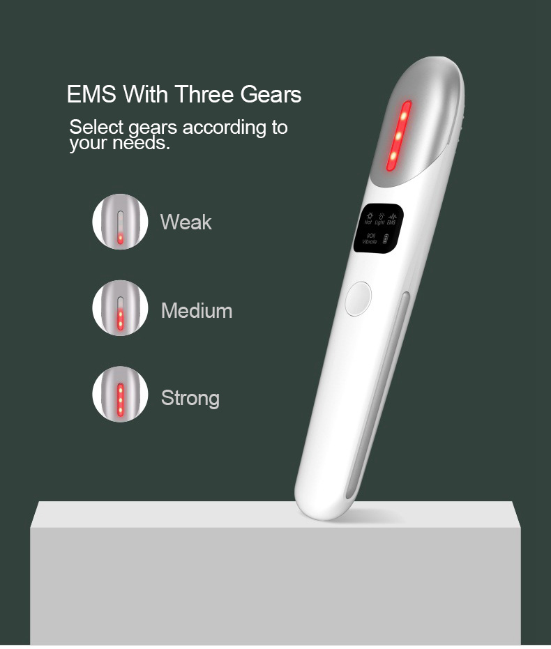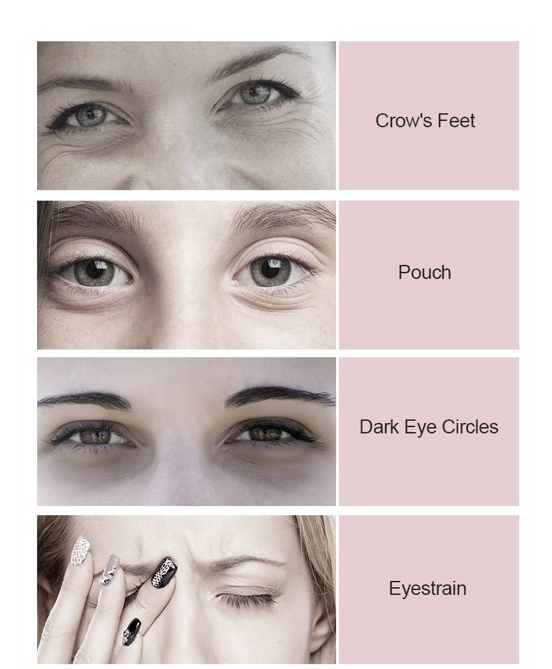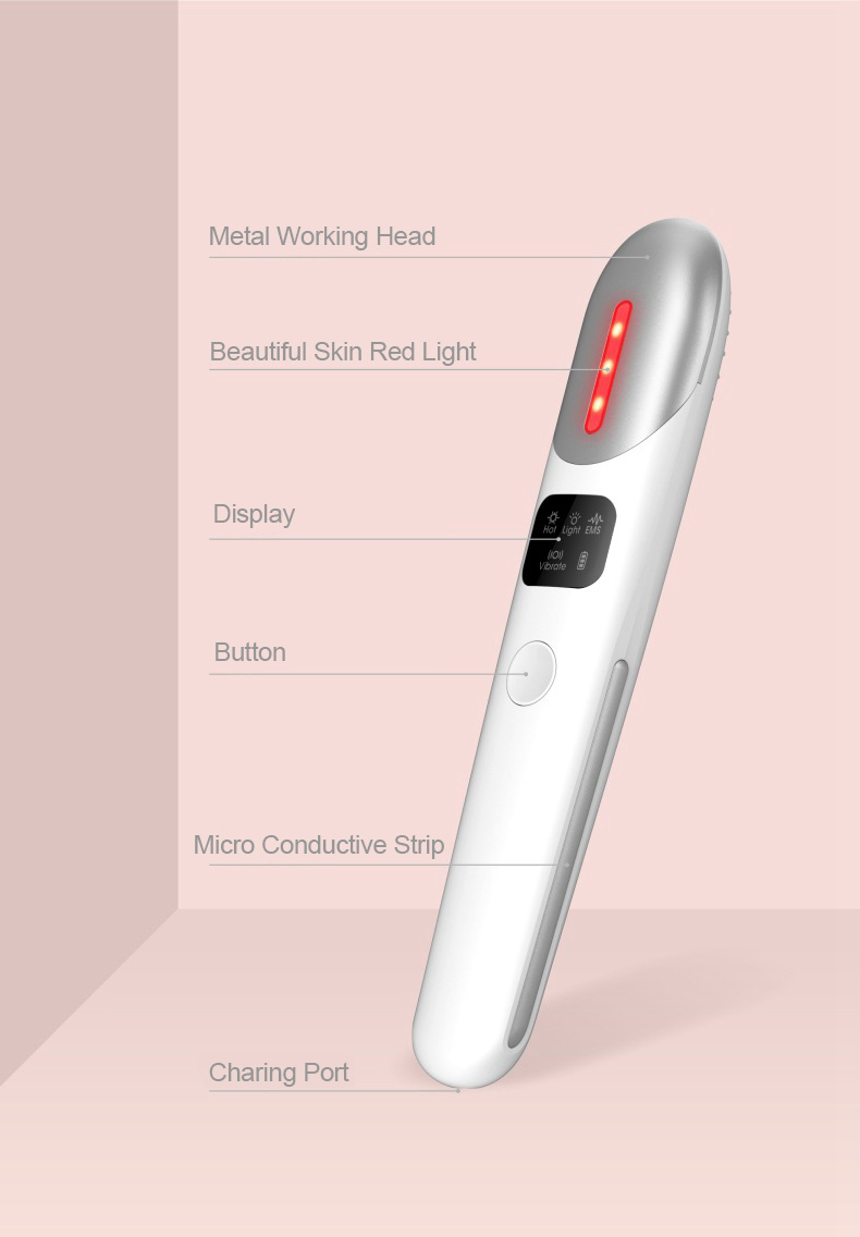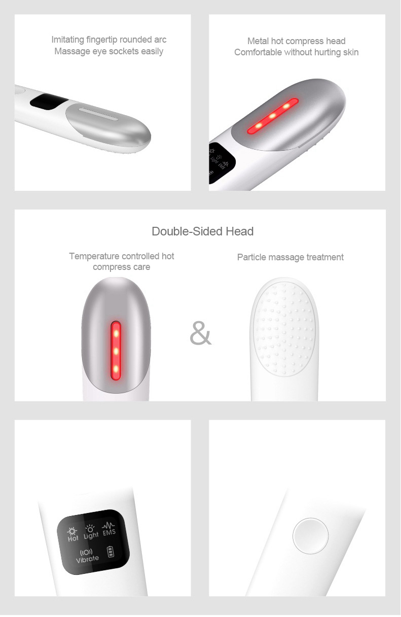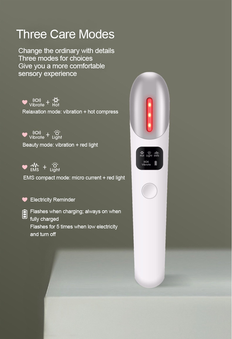 - Three nursing modes: Relaxation mode: vibration + hot compress; Beauty mode: vibration + red light; EMS compact mode: micro current + red light