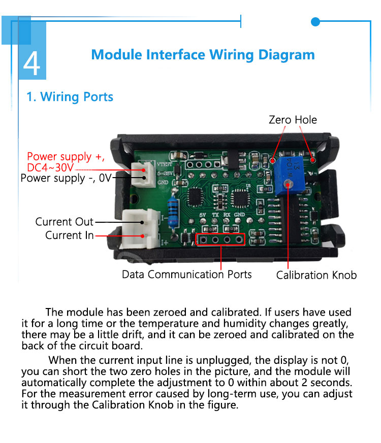 With its own anti-reverse connection circuit, the module will not work when the power supply is reversed, but it will not cause damage to the circuit. With over-current protection circuit, input current up to 1A will not cause damage to the circuit. When the current returns to plus or minus 70mA, the module will immediately measure the current value normally without restarting.