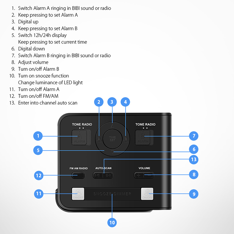 - Additional snooze function to counter oversleeping, simply press the snooze button once and go back to sleep, 9 minutes later the alarm will ring again, let you sleep at ease.