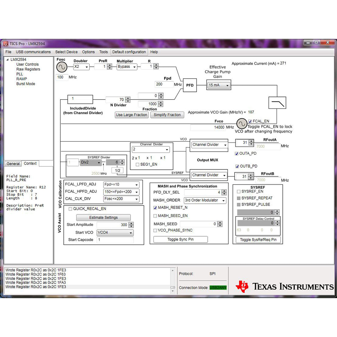 The output driver in LMX2594 provides output power up to 7dBm when the carrier frequency is 15GHz. The device uses a single 3.3V power supply and has an integrated LDO, eliminating the need for an on-board low-noise LDO.
