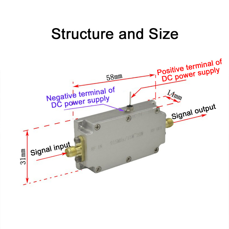 1. The input terminal (RF in) and the output terminal (RF out) of the module must be connected first. And then connect the module to a DC power supply.